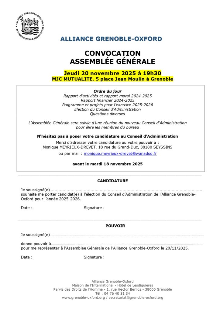 L’Alliance Grenoble-Oxford a le plaisir de vous convier à son Assemblée Générale
